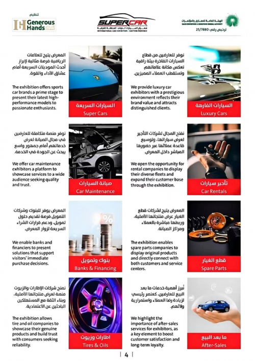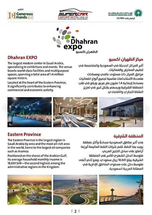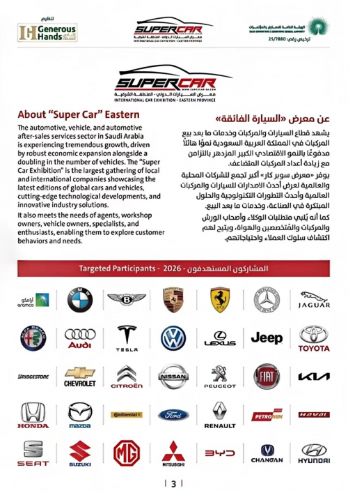 为响应国家 “走出去” 战略与 “一带一路” 倡议深度对接,落实商务部促进外贸高质量发展的工作部署。沙特东部省省长:萨乌德・本・纳伊夫・本・阿卜杜勒阿齐兹亲王殿下及政府机构,联合沙特 GENEROUS HANDS、RAKAZ ALARANIA 公司,定于 2026 年 4 月 23-25 日在沙特达曼 Dhahran EXPO 展馆共同主办 “2026 年沙特(达曼)超级汽车及零部件展览会”(SUPERCAR 2026)。值此盛会筹备之际,我们诚挚邀请贵单位携手参与,共拓中东汽车产业蓝海市场。